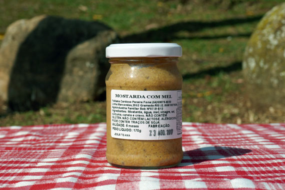 Descrição: Ronaldo e sua esposa produzem patês caseiros e diferentes tipos de mostarda, direto da sua propriedade, no interior de Gramado. Um dos produtos mais vendidos é a mostarda com mel. O grão amarelo é moído de forma lenta para não cozinhar, e misturado com mel silvestre, cravo, canela e temperos. Ideal para acompanhar carnes e molhos.